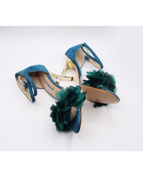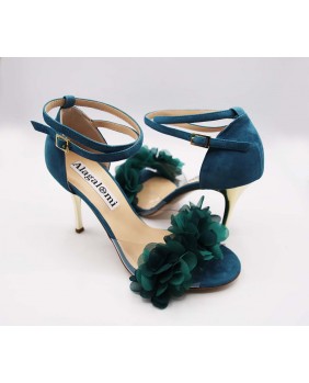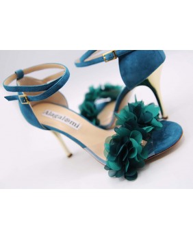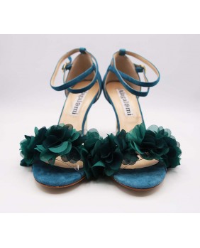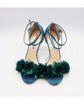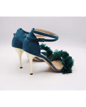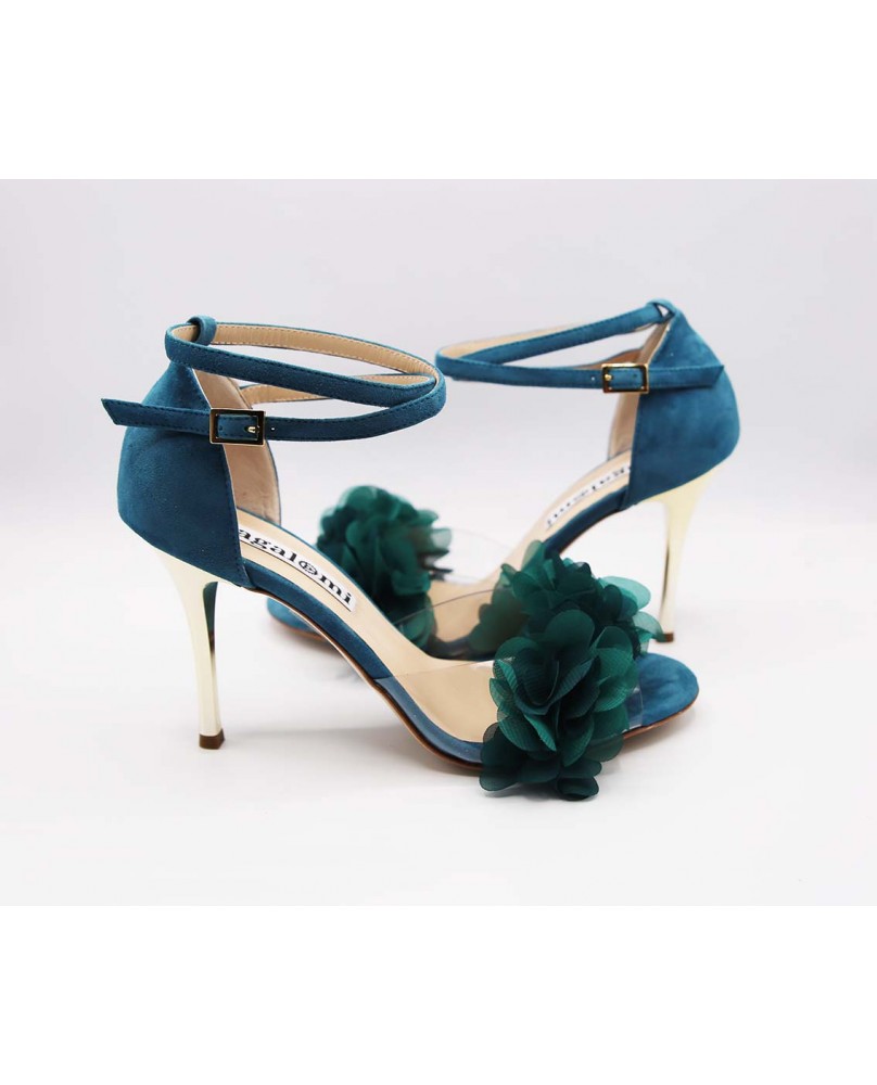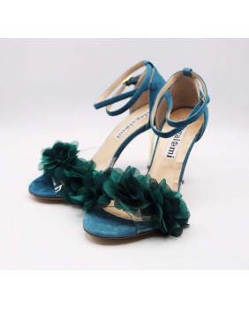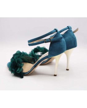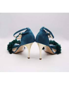 Isabel est un modèle avec une cage fermée à l'arrière un longue bride double tour avec passant sur la cage, une forme avant englobante en matière PVC sur ce modèle orné de fleurs pétrole. Un modèle à la forme classique mais ici enjolivé par le daim bleu/vert assorti aux fleurs et un talon doré miroir de 9 cm sur les photos mais qui existe dans toutes les hauteurs.