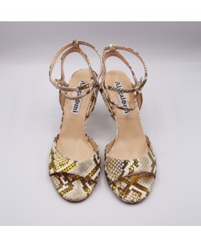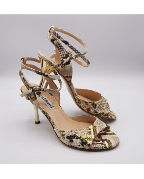 Magnifique modèle Maia en cuir crème et doré imitation python. Un matériau très original avec de beaux reflets. Arrière ouvert et bride double tour pour ce modèle classique et élégant avec un talon doré miroir.