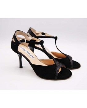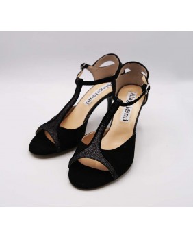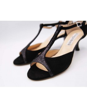 Modèle à cage fermée à l'arrière avec de très originales découpes en double matière. Daim et paillettes noirs composent ce modèle classique et élégant avec sa bride T, sa partie avant en deux matières et son talon noir brillant. Semelle en cuir mais existe en daim.