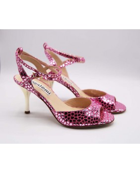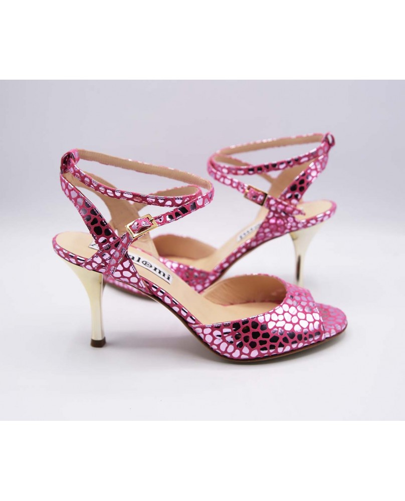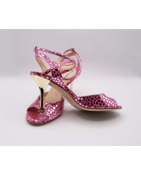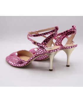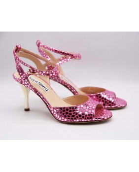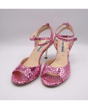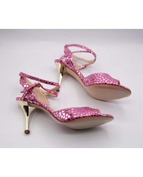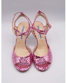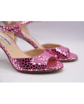 Magnifique modèle Rosa en cuir brillant rose clair avec des motifs en forme de ronds. Un matériau très original et lumineux pour l'été ou les soirées habillées. Arrière ouvert et bride double tour pour ce modèle coloré et élégant avec un talon doré miroir.