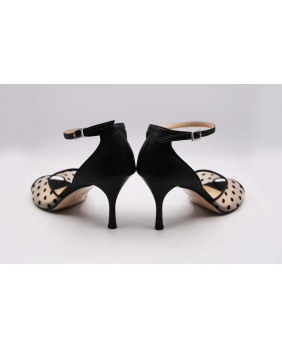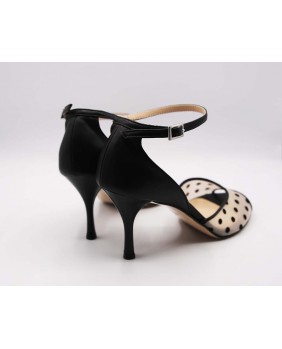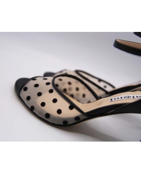 Modèle cage fermée à l'arrière, avec une forme escarpin et un imprimé à pois translucide sur le devant. Confectionné en cuir satiné noir, ce modèle est classique et élégant avec son talon noir brillant pour un look unique. Bride cheville double tour disponible et semelle en cuir ou en daim.