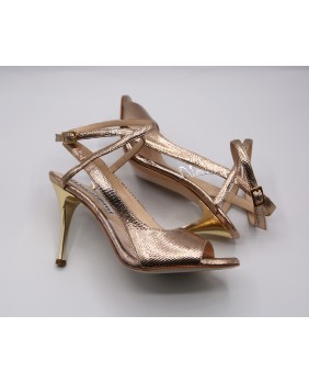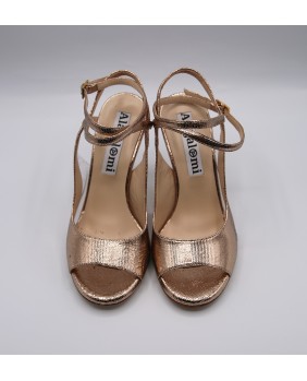 Le modèle Diva est une forme originale et exclusive de la marque Alagalomi. Magnifique, élégant et très "femme", il est ici décliné en cuir doré brillant doré et PVC sur le côté avec une découpe originale. Le talon doré miroir sublime ce modèle.
