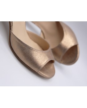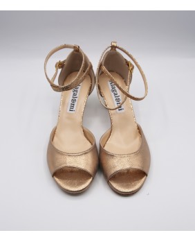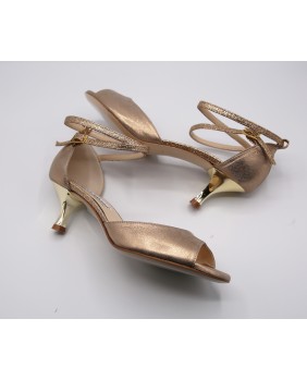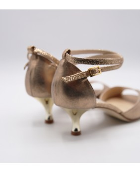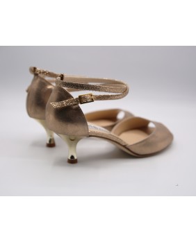 Isabel est un modèle avec une cage fermée à l'arrière, une longue bride double tour avec passant sur la cage, une forme avant englobante. Un modèle à la forme classique mais ici enjolivé par des paillettes platine sur la bride et la tranche. Talon de 5 cm doré sur les photos mais existe dans toutes les hauteurs.