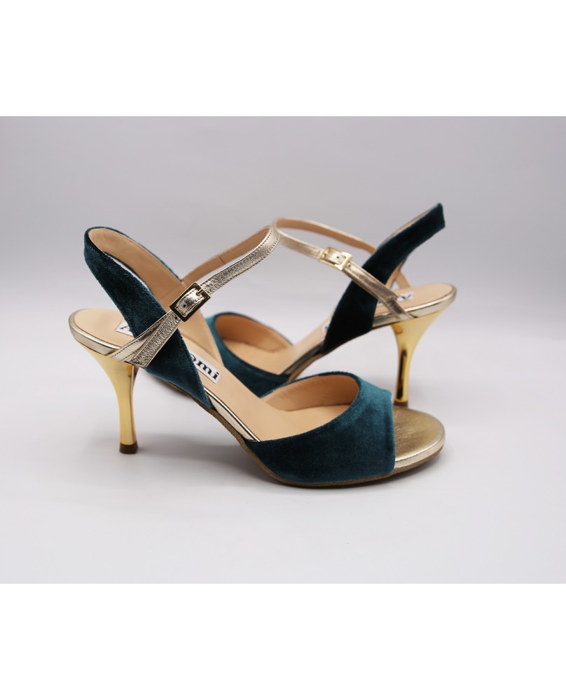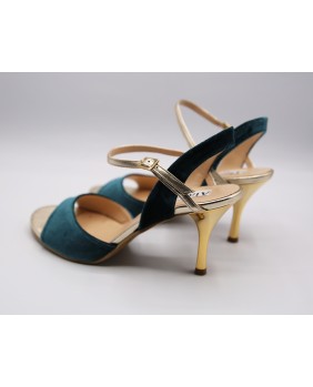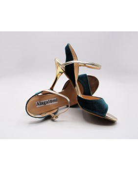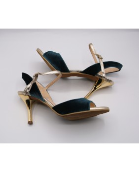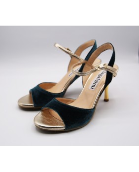 Magnifique modèle Maia en velours pétrole et cuir doré. Arrière ouvert et bride simple tour pour cette version mais existe avec une bride double et l'arrière en cuir doré. Talon doré miroir bien évidemment. Ce modèle existe aussi en velours bordeaux. Ici la semelle est en daim mais le modèle existe avec une semelle cuir et dans toutes les hauteurs de talons du 5 au 9 cm.