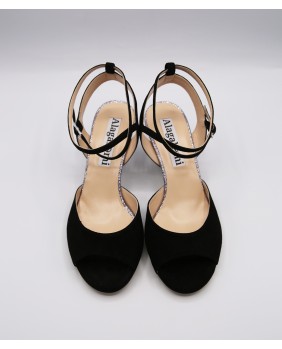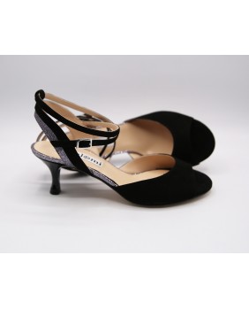 Magnifique modèle Nina en daim noir et paillettes assorties. Un matériau très souple et intensément mat. Arrière ouvert avec une large bride double matière, une bride double tour pour ce modèle classique et élégant avec un petit talon noir brillant.