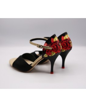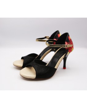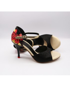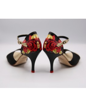 Un des modèles phare de la marque créé par Dumitru Mihaica, le designer de Mono. Fabriqué en vernis noir mat à petits carreaux très fins, cuir satiné doré pailleté et cuir imprimé à motif de roses, cette forme est classique avec une cage fermée et une bride courte. Ce modèle est aussi composé d'un talon noir avec des embouts rouges, un des détails typiques de Mono, mais aussi d'un petit strass sur la boucle de la bride. Quatre hauteurs de talons possibles : 5 cm, 7 cm, 8 cm et 9 cm ainsi que 3 types de semelle : daim, la plus souple et qui peut être colorée, la semi-rigide et le cuir.