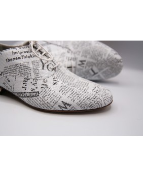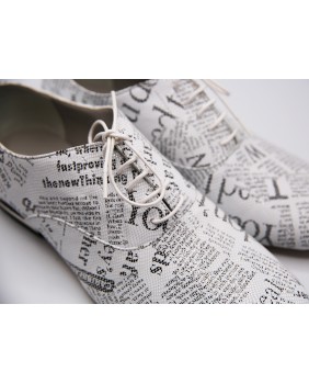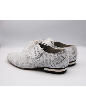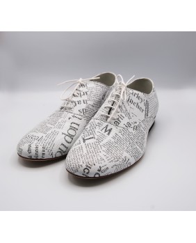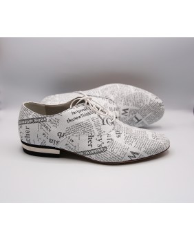 Le modèle homme emblématique de la marque créé par Dumitru Mihaica, le designer de Mono. Fabriqué en cuir blanc avec imprimé effet journal, ce modèle à la  forme classique derbies sans rabat et une seule découpe sur le dessus du pied dispose d'un talon bicolore noir et blanc de 2.5 cm.  Il peut se décliner dans toutes les couleurs et matériaux avec 3 types de semelle : daim, la plus souple et qui peut être colorée, la semi-rigide et le cuir.