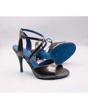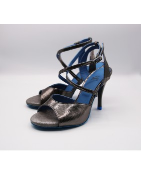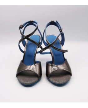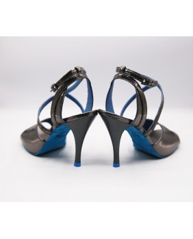 Un design original de la marque créé par Dumitru Mihaica, le designer de Mono. Fabriqué en cuir brillant anthracite, cette forme reste classique avec une bride double tour croisée sur le pied et une bride arrière double épaisseur originale. Ce modèle est ici doublé de cuir bleu assorti à la semelle en daim et aux embouts des talons. Il peut se fabriquer dans toutes les couleurs et matériaux et il existe des centaines de cuirs, plus de 20 vernis différents dont plusieurs vernis miroir. Quatre hauteurs de talons possibles : 5 cm, 7 cm, 8 cm et 9 cm ainsi que 3 types de semelle : daim, la plus souple et qui peut être colorée, la semi-rigide et le cuir.
