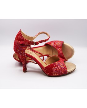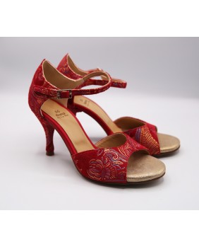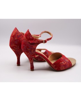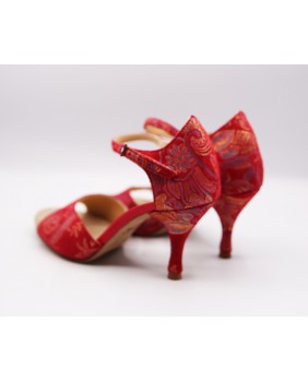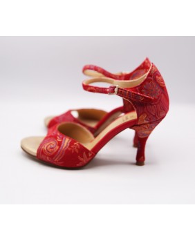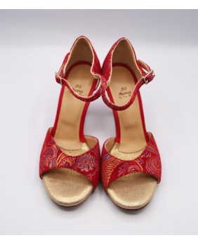 Fabriqué en tissu rouge imprimé doré, cette forme est classique avec une cage fermée et une bride courte. Ce modèle est aussi composé d'un talon couvert du même tissu avec des embouts rouges assortis, un des détails typiques de Mono, mais aussi d'un petit strass sur la boucle de la bride et une cage arrière pointue pour plus d'élégance. Quatre hauteurs de talons possibles : 5 cm, 7 cm, 8 cm et 9 cm ainsi que 3 types de semelle : daim, la plus souple et qui peut être colorée, la semi-rigide et le cuir.