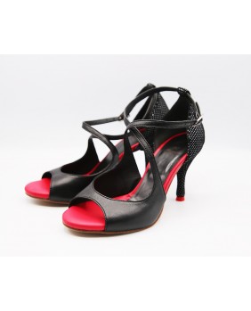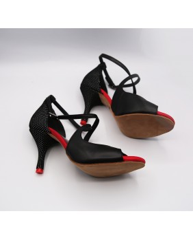 Fabriqué en daim noir à petits pois blancs très discrets et cuir satiné noir, ce modèle est très élégant avec une cage fermée, deux brides jointes à la partie avant qui se croisent sur le pied. Il est ici proposé avec le talon recouvert de daim, mais il peut être noir ou rouge. Semelle et embouts de talon rouges sont les dernières touches d'élégance. Ce modèle peut se fabriquer dans toutes les couleurs et matériaux. Quatre hauteurs de talons possibles : 5 cm, 7 cm, 8 cm et 9 cm ainsi que 3 types de semelle : daim, la plus souple et qui peut être colorée, la semi-rigide et le cuir.
