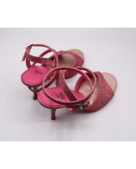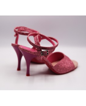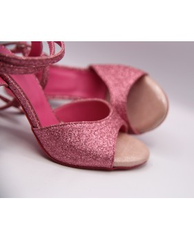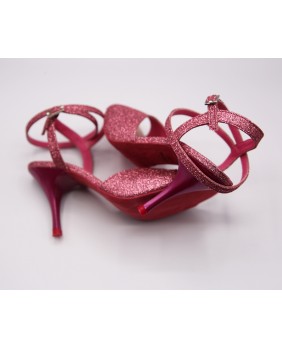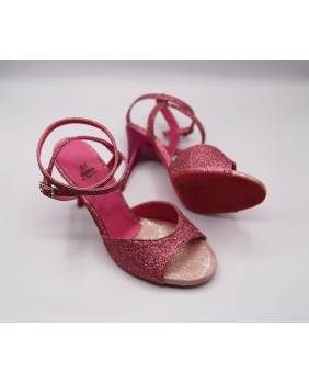 Ce modèle a une forme parmi les plus classiques, avec un avant ouvert, une bride double tour (soit autour de la cheville, soit autour du pied) et une bride fine arrière. Fabriqué entièrement en tissu pailleté rose, il propose des petits détails insolites pour se différencier : des embouts de talon roses, une semelle et un talon assorti et un strass sur la boucle de la bride. Ce modèle peut être fabriqué dans toutes les couleurs et matériaux. Quatre hauteurs de talons possibles : 5 cm, 7 cm, 8 cm et 9 cm ainsi que 3 types de semelle : daim, la plus souple et qui peut être colorée, la semi-rigide et le cuir.