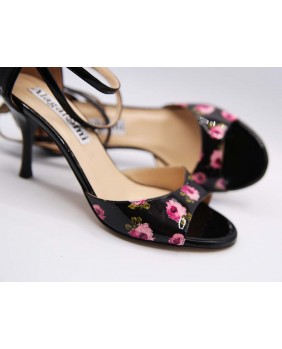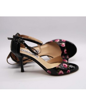 Modèle à cage fermée à l'arrière avec une bride longue en superposition sur la cage. Fabriqué en vernis noir uni et en vernis noir à fleurs sur la partie avant. Ce modèle est classique mais le motif à fleurs tout en étant discret le rend très élégant. Talon noir brillant, bride double tour cheville et semelle en cuir terminent ce modèle.