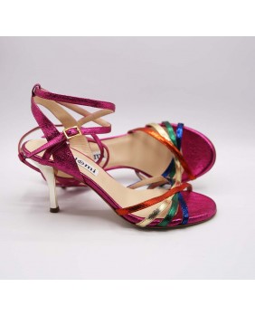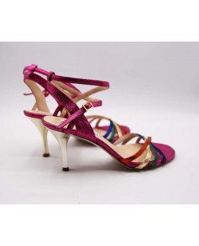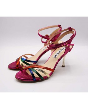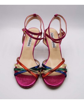 Voici le modèle "Estrella" de la marque Alagalomi, fabriqué dans plusieurs cuirs brillants mélangés. Quatre brides croisées composent la partie avant et l'arrière a une cage ouverte avec une large bride de talon et une longue bride double tour pour la cheville. Vous pouvez composer votre propre modèle en mélangeant les couleurs. Semelle en cuir ou en daim au choix et disponible dans toutes les hauteurs de talon du 5 au 9 cm.