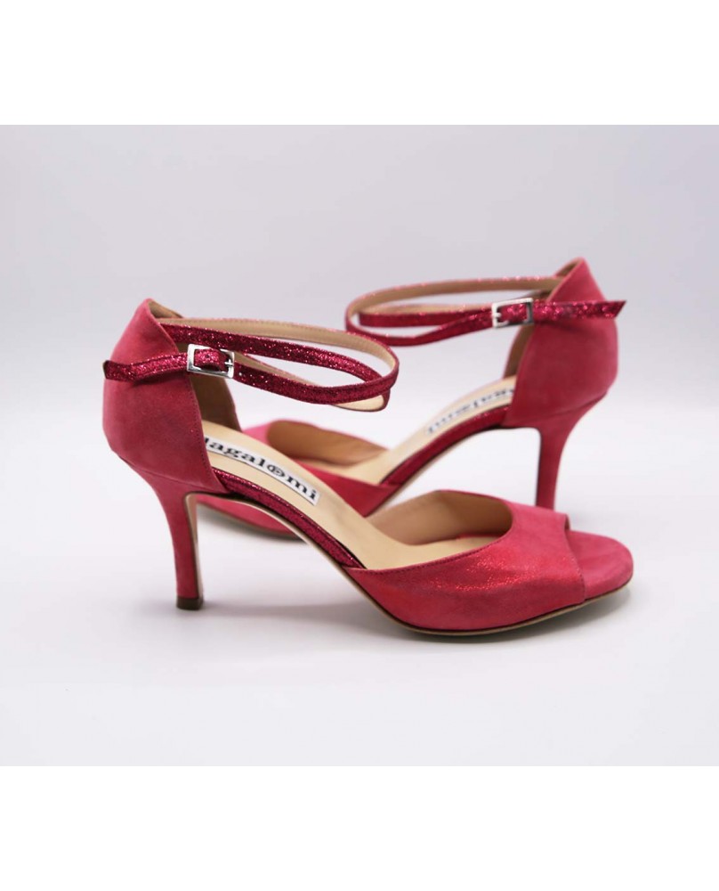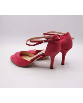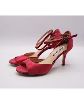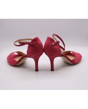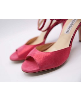 Magnifique modèle Isabel en cuir satiné rose et paillettes assorties. Cette forme classique a une cage fermée à l'arrière avec une longue bride double tour, un avant ouvert en "peep toe" et un talon recouvert de cuir pour un total look rose. Semelle en cuir ou en daim au choix et disponible dans toutes les hauteurs de talon du 5 au 9 cm.