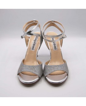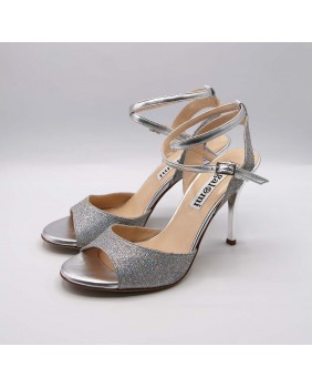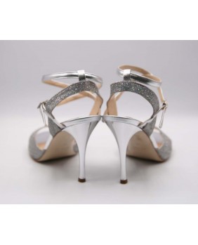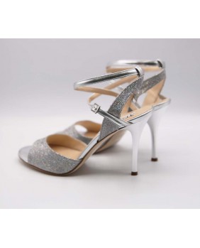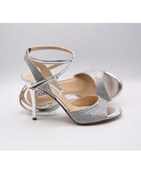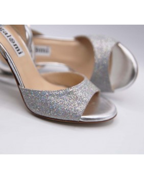 Magnifique modèle Maia en cuir argenté mat et paillettes argent irisées à reflets multicolores. Un matériau très lumineux qui brille le soir mais reste plus discret la journée et qui va avec tout ! Arrière ouvert et bride double tour pour ce modèle classique et élégant avec un talon argent miroir.