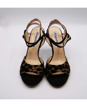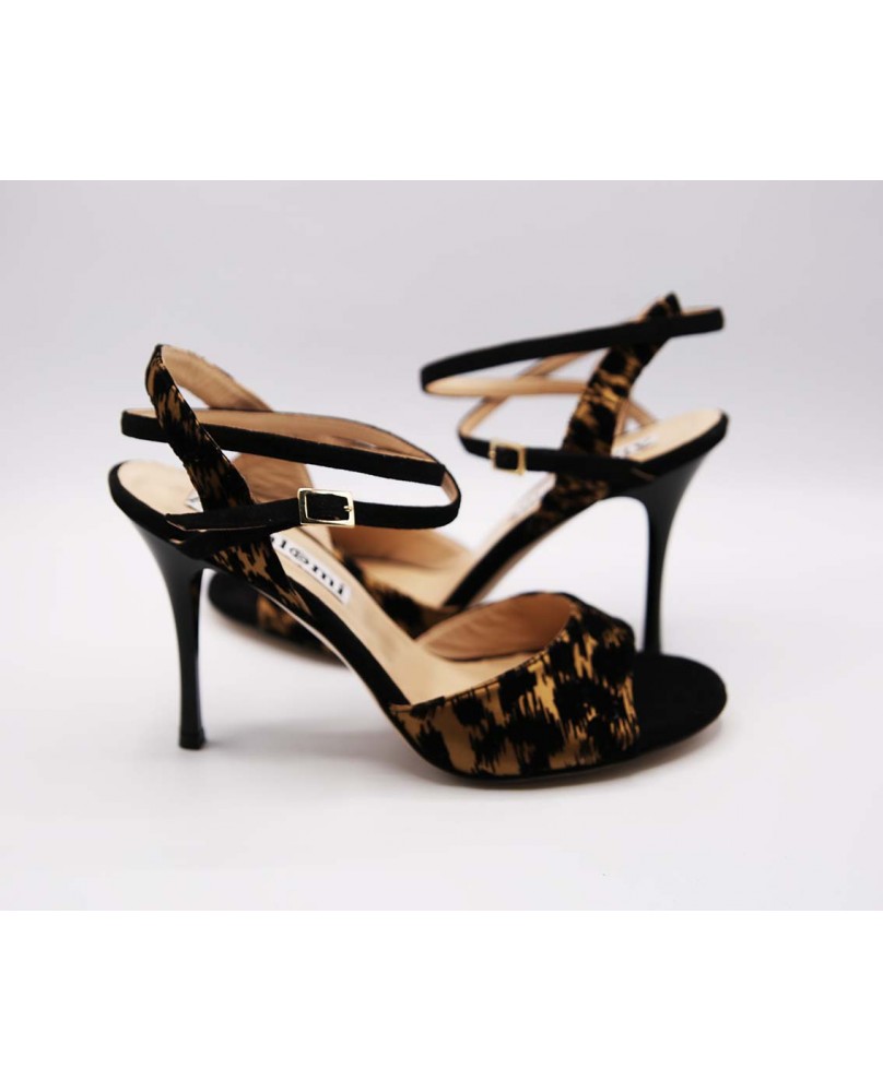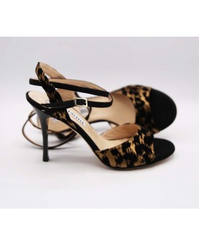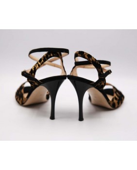 Le modèle "Maia", la forme la plus classique de la marque, ici décliné en daim noir uni et en velours noir et bronze très élégant. Un matériau très discret mais tellement original ! Arrière ouvert et bride double tour pour ce modèle classique et intemporel avec un talon noir brillant.