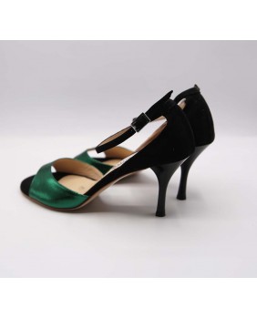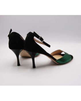 Le modèle "Penny" est ici décliné en daim noir uni et en cuir imprimé vert émeraude brillant. C'est une forme à cage fermée haute avec une bride simple cheville haute elle aussi et une belle découpe cintrée sur les côtés. Ce modèle reste très classique et élégant avec son talon noir brillant. On peut lui donner plus de peps en utilisant d'autres matériaux. Il est fabricable en talon 5 cm, 7 cm, 8 cm et 9 cm.