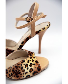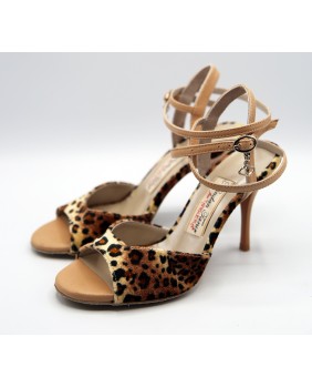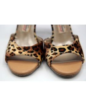 Modèle en cuir beige et daim imprimé léopard à l'avant et sur la tranche. Bride double position soit sur le pied soit autour de la cheville. Talon moka de 8 cm sur les photos mais existe en 7 cm large, 9 cm et 9 cm spécial.
