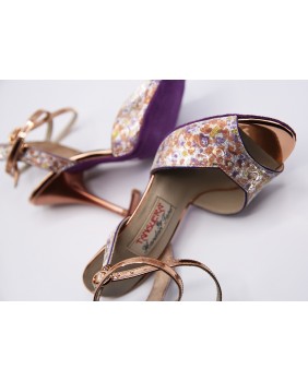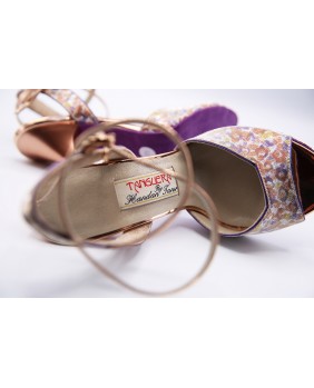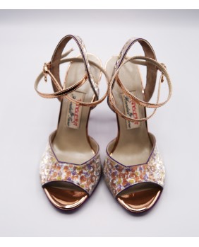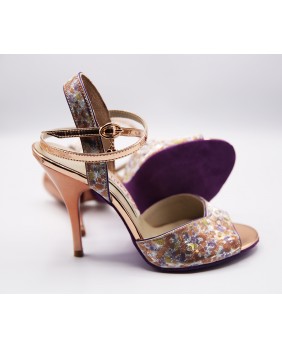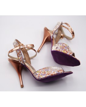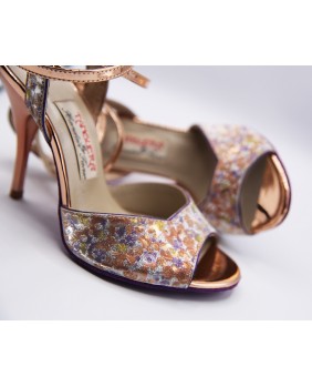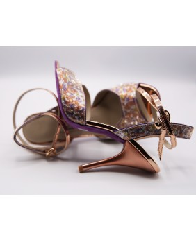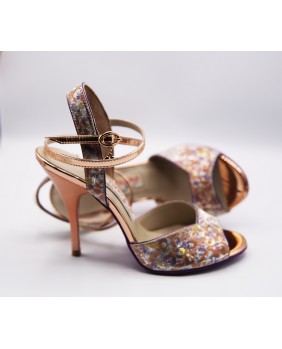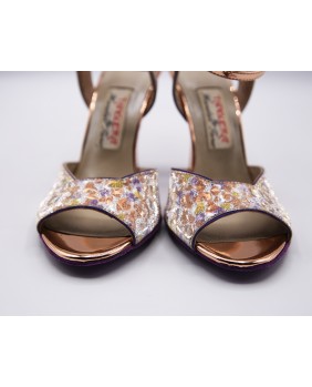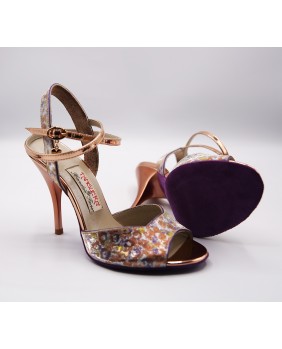 Vernis brillant doré imprimé léopard. Matériau très original qui change de couleur avec la lumière. Semelle de couleur violette sur ce modèle et talon cuivé mat.