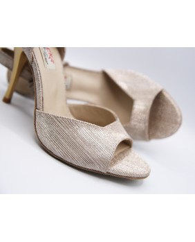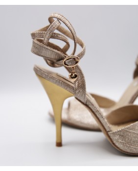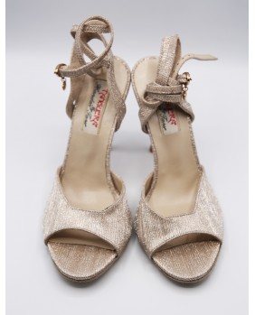 Modèle entièrement en tissu pailleté doré clair avec de très discrètes lignes. Le talon doré mat et la semelle beige clair font de ce modèle une paire classique mais originale et très élégante. Bride double position soit autour du pied, soit autour de la cheville. Existe en plusieurs combinaisons de couleurs entre talon, semelle et tissu pailleté.
