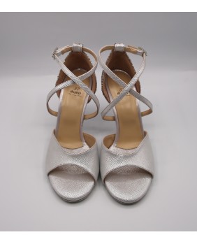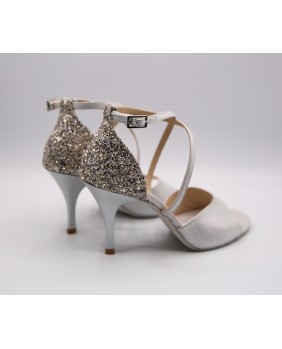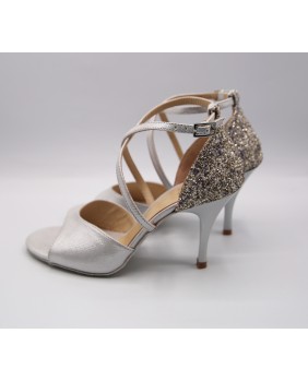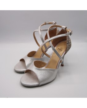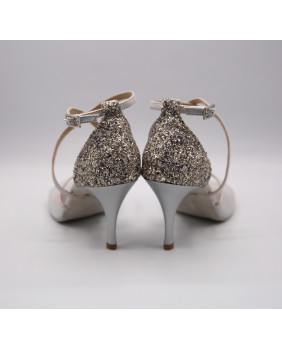Ce modèle est fabriqué en cuir nacré perlé gris clair et paillettes en dégradé de couleurs assorties. Il a une forme très classique avec une cage fermée, une bride longue croisée autour du pied et qui part du haut de la cage et un talon argent clair assorti. Il est décliné dans toutes les couleurs et matériaux et il existe des centaines de possibilités. Quatre hauteurs de talons possibles : 5 cm, 7 cm, 8 cm et 9 cm ainsi que 3 types de semelle : daim, la plus souple et qui peut être colorée, la semi-rigide et le cuir.