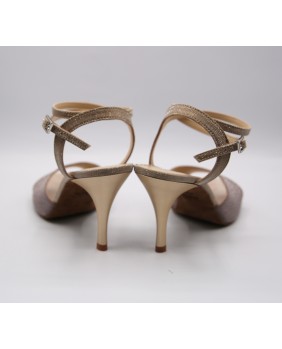 Ce modèle a une forme parmi les plus classiques, avec un avant ouvert, une bride double tour (soit autour de la cheville, soit autour du pied) et une bride fine arrière. Fabriqué entièrement en tissu pailleté taupe et doré, il propose des petits détails insolites pour se différencier comme une semelle et un talon assortis et un strass sur la boucle de la bride. Il peut être fabriqué dans toutes les couleurs et matériaux. Quatre hauteurs de talons possibles : 5 cm, 7 cm, 8 cm et 9 cm ainsi que 3 types de semelle : daim, la plus souple et qui peut être colorée, la semi-rigide et le cuir.