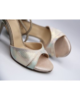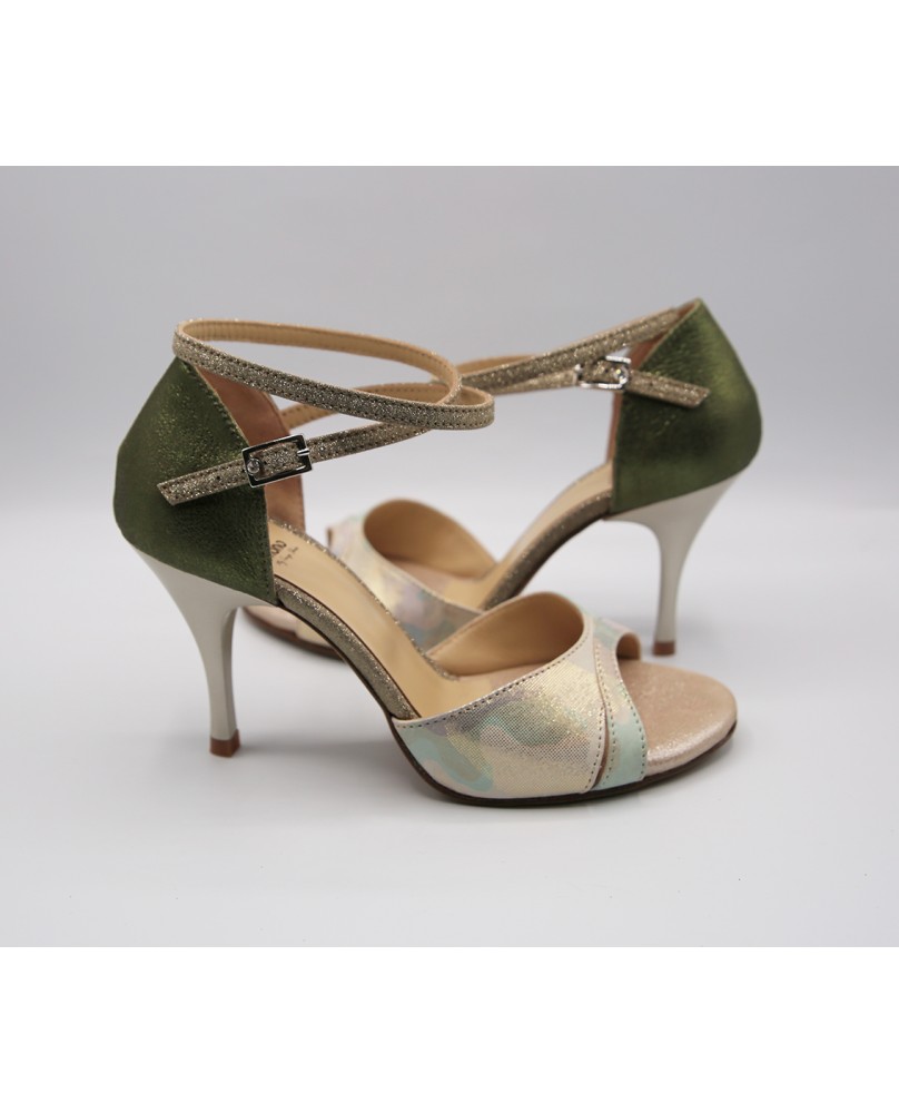 Fabriqué en cuir imprimé nacré clair et cuir vert olive brillant, cette forme est classique avec une bride double tour (soit autour de la cheville, soit autour du pied), une cage arrière fermée et une découpe originale sur la partie avant. Ce modèle est décliné dans toutes les couleurs et matériaux et il existe des centaines de possibilités. Quatre hauteurs de talon sont disponibles : 5 cm, 7 cm, 8 cm et 9 cm ainsi que 3 types de semelle : daim, la plus souple et qui peut être colorée, la semi-rigide et le cuir.