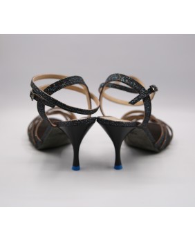 Le MF600BA est un modèle à la forme classique style danse de salon. Réalisé en paillettes gris bleuté, il est doté d'un arrière ouvert, idéal pour le tango argentin, et d'une bride croisée. Talon noir brillant et embout bleu terminent la chaussure en beauté. Il est disponible dans toutes les couleurs et matières. Quatre hauteurs de talon sont disponibles : 5 cm, 7 cm, 8 cm et 9 cm, ainsi que trois types de semelles : daim (la plus souple et colorable), semi-rigide et cuir.