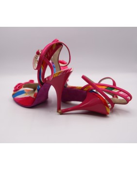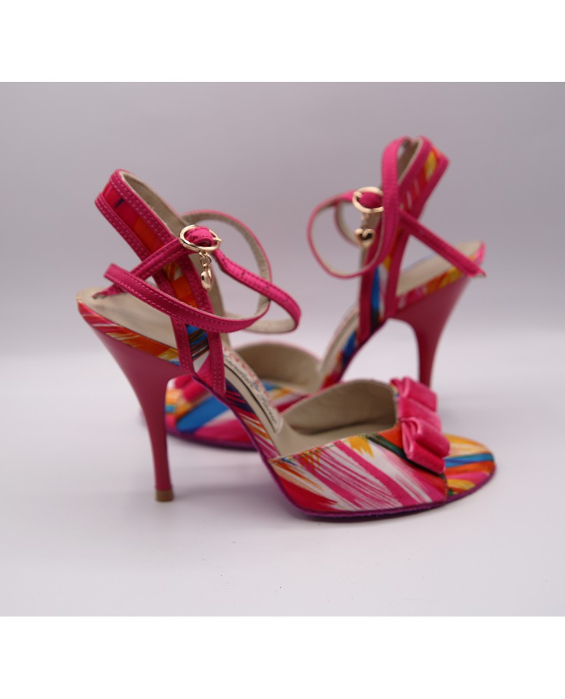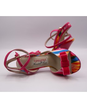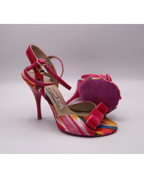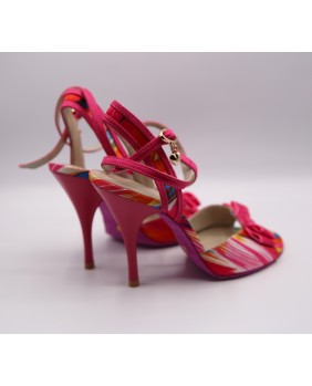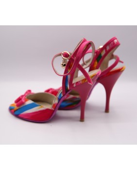 Nouveau modèle en tissu imprimé très coloré avec des tons de rose et rouge. Talon et semelle roses assortis. Longue bride double position, surpicure sur la bride arrière en satin rose et ruban de velours rose sur la partie avant. Talon de 9 cm cambrure prononcée sur les photos mais existe en 7 cm (rouge), 8 cm, 9 cm et 9 cm (spécial).