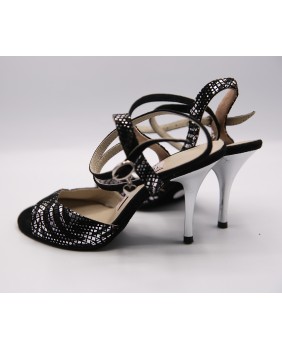 Modèle en daim noir imprimé argent et forme classique avec arrière ouvert. bride longue en daim noir uni, talon argenté et semelle noire. Peut se fabriquer dans de nombreux autres matériaux et couleurs.