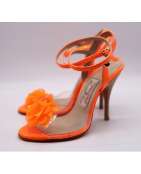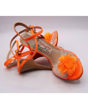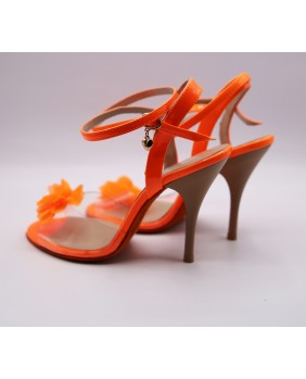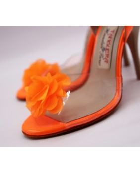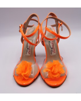 Modèle en vernis orange fluorescent et matériau souple transparent qui laisse apparaître l'ensemble du pied, orné d'une fleur sur le dessus. Semelle orange et talon moka de 9 cm spécial sur les photos mais existe en 7 cm, 8 cm et 9 cm. Ce modèle peut se décliner dans toutes les couleurs de vernis et le matériau transparent peut être bordé comme notre modèle NT015.