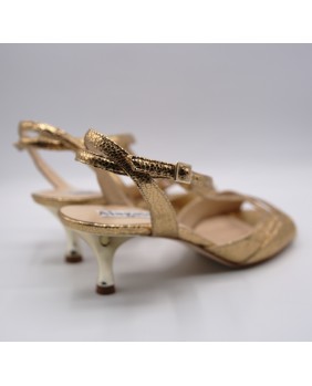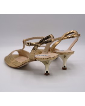 Le modèle "Alma" de la marque Alagalomi est fabriqué en cuir doré atnique avec des reliefs et propose une forme très originale. Il dispose d'un arrière ouvert avec une bride double sur le talon. L'avant est aussi composé de deux brides superposées avec une fine découpe sur les orteils et le talon est doré brillant. Semelle en cuir ou en daim au choix et disponible dans toutes les hauteurs de talon du 5 au 9 cm.