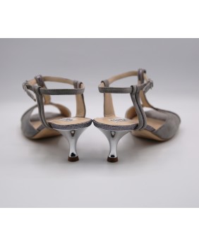 Modèle ouvert à l'arrière avec deux brides entrelacées, la forme Antea de chez Alagalomi propose aussi une bride T en paillettes argenté foncé qui se termine sur l'avant du pied. Très original, ce modèle s'accompagne d'un talon argent miroir. Disponible dans toutes les hauteurs et avec semelle en daim.