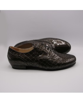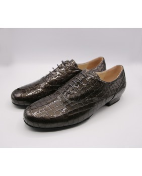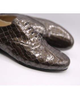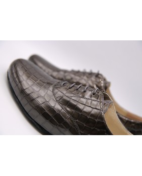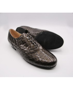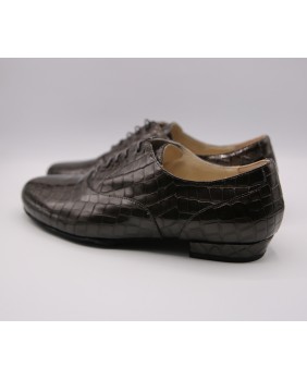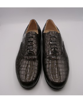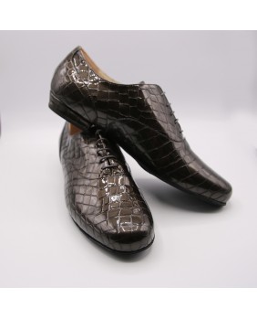 Modèle entièrement en cuir vernis imitation croco gris foncé, découpes élégantes et semelle en daim noir. Disponible également avec une semelle en cuir. Modèle très sobre et classique, disponible dans toutes les couleurs de cuir et de daim.