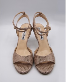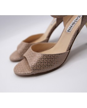 Magnifique modèle Maia en daim beige à imprimé Liberty doré. Un matériau très original avec de beaux reflets. Arrière ouvert et bride double tour pour ce modèle classique et élégant avec un talon doré miroir.