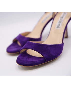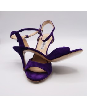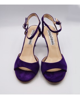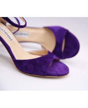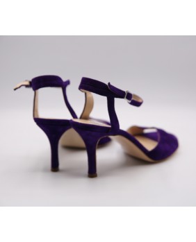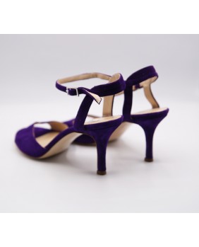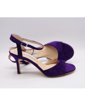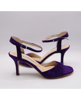 Voici le modèle "Maquina Tanguera" ici décliné en daim violet. L'originalité de ce modèle réside dans ses brides qui sont entrelacées sur le talon. Ici en version simple, elles peuvent être double ou triples. Talon recouvert de 7 cm pour cette version mais existe en 5 cm, 8 cm et 9 cm aussi. Pour finir vous pouvez choisir entre une semelle cuir comme sur les photos ou en daim noir ou rouge.