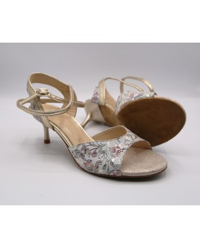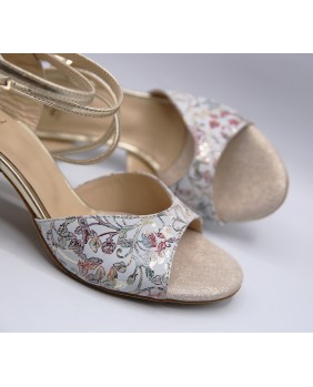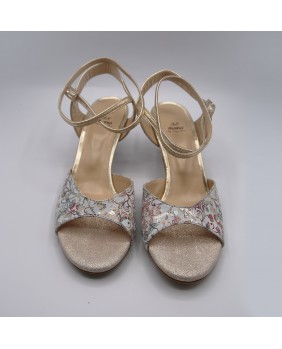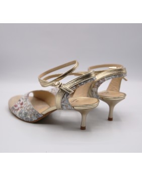 Ce modèle est fabriqué en cuir imprimé à motif arabesques doré et cuir doré mat avec une forme classique composé d'un avant ouvert, d'une bride double tour (soit autour de la cheville, soit autour du pied) et une large bride arrière double matière. Il peut se fabriquer dans toutes les couleurs et matériaux et il existe des centaines de possibilités. Le talon est de  5 cm sur les photos mais il existe quatre hauteurs de talons possibles : 5 cm, 7 cm, 8 cm et 9 cm ainsi que 3 types de semelle : daim, la plus souple et qui peut être colorée, la semi-rigide et le cuir.