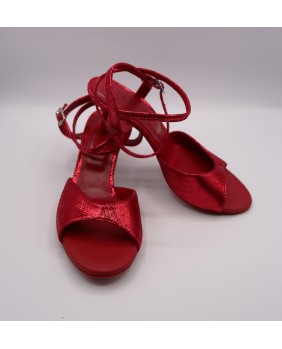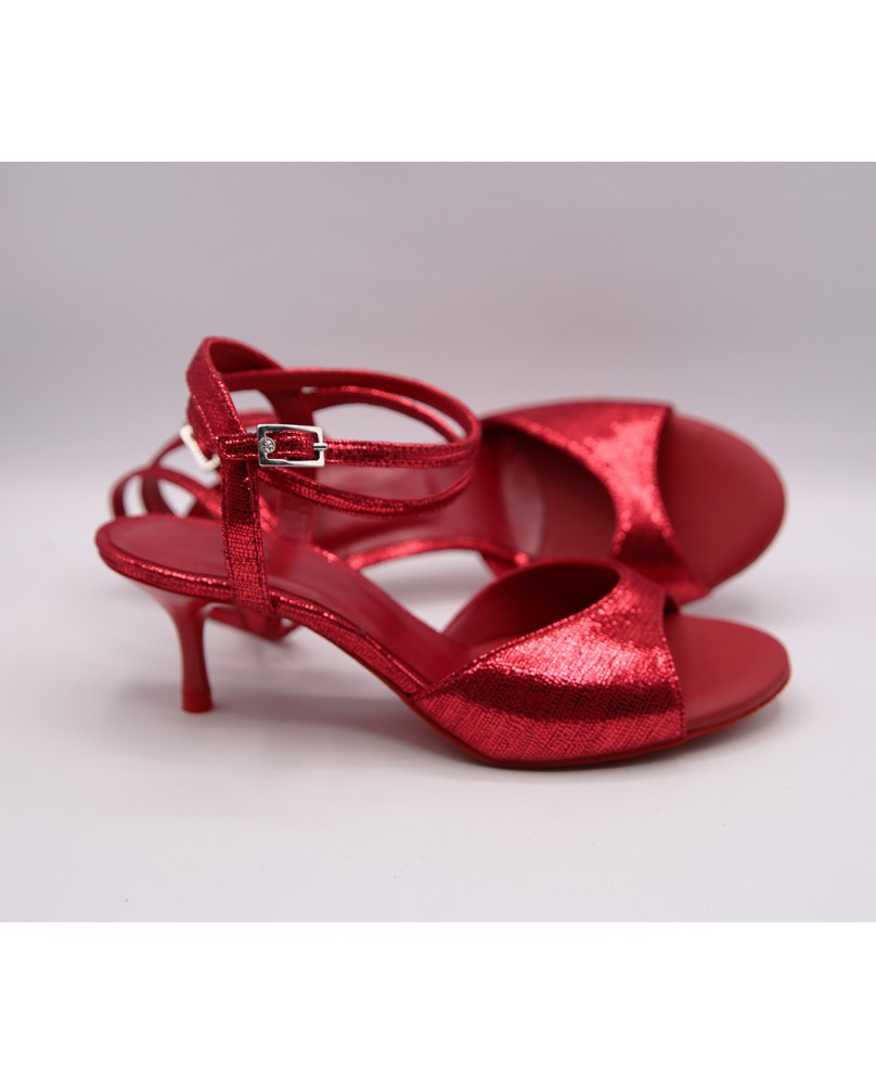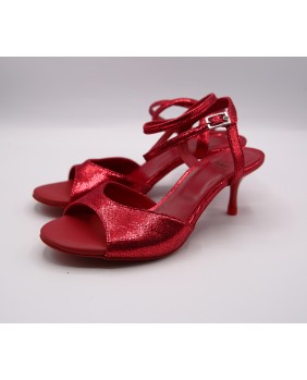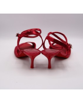 Ce modèle a une forme parmi les plus classiques, avec un avant ouvert, une bride double tour (soit autour de la cheville, soit autour du pied) et une bride fine arrière. Fabriqué entièrement en cuir brillant rouge, il propose des petits détails insolites pour se différencier : des embouts de talon rouges et un strass sur la boucle de la bride. Ce modèle peut être fabriqué dans toutes les couleurs et matériaux. Talons 5 cm sur les photos mais quatre hauteurs de talons possibles : 5 cm, 7 cm, 8 cm et 9 cm ainsi que 3 types de semelle : daim, la plus souple et qui peut être colorée, la semi-rigide et le cuir.