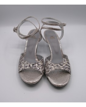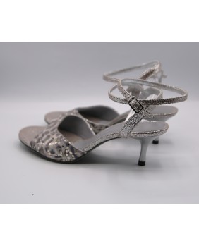 Ce modèle a une forme parmi les plus classiques, avec un avant ouvert, une bride double tour (soit autour de la cheville, soit autour du pied) et une bride fine arrière. Fabriqué en cuir argenté clair et en daim imprimé argenté, il propose des petits détails insolites pour se différencier tel qu'un strass sur la boucle de la bride. Ce modèle peut être fabriqué dans toutes les couleurs et matériaux. Talons 5 cm sur les photos mais quatre hauteurs de talons possibles : 5 cm, 7 cm, 8 cm et 9 cm ainsi que 3 types de semelle : daim, la plus souple et qui peut être colorée, la semi-rigide et le cuir.