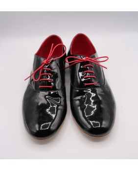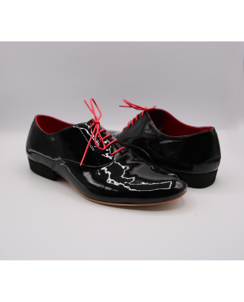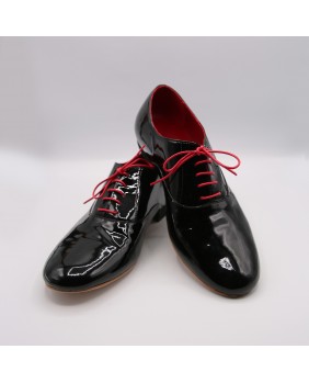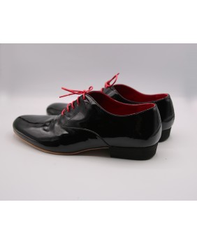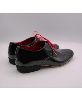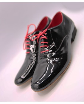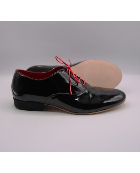 Ce modèle homme classique forme "ballroom" est ici fabriqué en cuir vernis noir. Il possède une seule découpe sur le dessus du pied et dispose d'un talon noir de 2.5 cm. Il est entièrement doublé de cuir rouge pour plus d'élégance. Il peut se décliner dans toutes les couleurs et matériaux avec 3 types de semelle : daim, la plus souple et qui peut être colorée, la semi-rigide et le cuir.